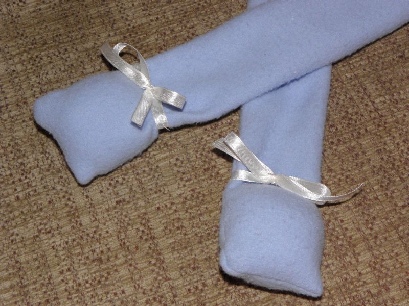Poduszka Jasiek o wymiarach 40x40cmubrana w jasnoniebieskie polarowe królicze wdzianko z długimi wiązanymi rekami, długimi zwisającymi nogami i jeszcze dłuższymi uszami. Stopy są wypełnione poliestrowym wkładem, aby mogły swobodnie opadać i zdobione satynową 6mm kremową tasiemką zawiązaną w kokardkę. Oczy są naszyte za pomocą zagęszczonego ściegu zygzakowatego. Z tyłu poszewka ma dodatkowo zapięcie z białego plastikowego zatrzasku.